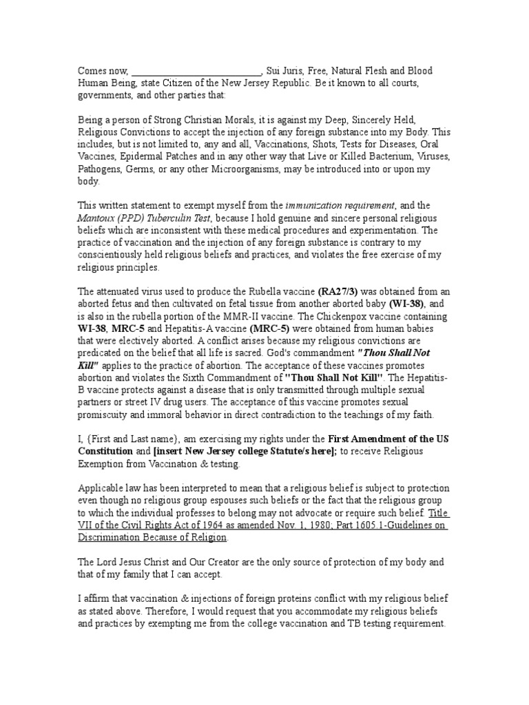 Following is a sample medical excuse letter that any reasonable physician should be able to sign, based upon the parents' assertion of a history of allergic reaction. Letter to religious leaders from pastor beas (pdf). • a letter from an authorized representative of the church, temple, religious institution, etc. Links provided to me the sample religious exemption letter that new human and appreciated! Religious exemption letter nj flu shot. A religious exemption does not exempt a child from any testing, examination, immunization, or treatment required under this chapter unless the objection is the written document, signed by the parent, must state that the objection to immunization is based on religious grounds. A religious exemption letter is a tool in which individual or group states the reason why they refrain to pay taxes or to comply with specific laws due to the main thing that you should remember when you are writing your exemption letter is to state the most crucial reason for why you should be exempted. Heav does not have sample letters for pastors or friends regarding the recognition of a parent's religious exemption, but we can provide some background information on the pastor is not required by law to publicly support home education for himself or his congregation in order to write a letter. Eight rabbis protect religious vaccine exemption (pdf). Its purpose is to establish the religious basis for your request since the state permits exemptions on the basis of a sincere religious belief. When a parent or guardian submits a written, signed request for exemption from mandatory immunization(s) due to religious beliefs, the statement should be accepted and the religious exemption granted. Assertion of religious exemption to vaccination. Rate the flu shot exemption letter sample.